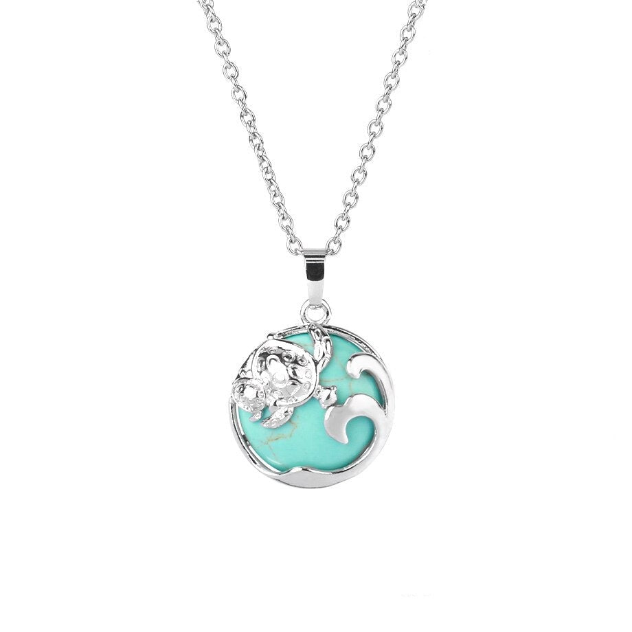 You'll love the unique style of this turtle and turquoise stone necklace.