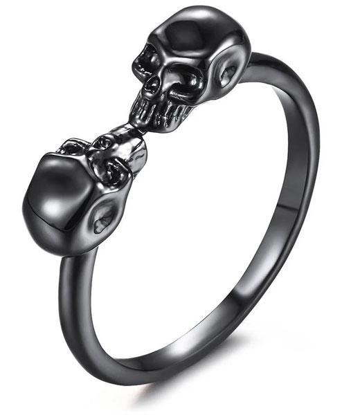 This ring with 2 kissing skulls in steel is a perfect representation of two lovers united. You can see them kissing each other to death.