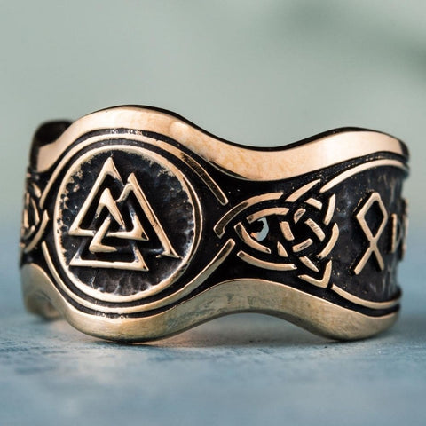 Discover this solid bronze runic ring. It is adorned with the famous Scandinavian symbol, Valknut. This symbol is strongly associated with the god Odin and is considered an emblem of the warriors of Valhalla. The words "Hail Odin" are engraved in runes on the sides of the ring.