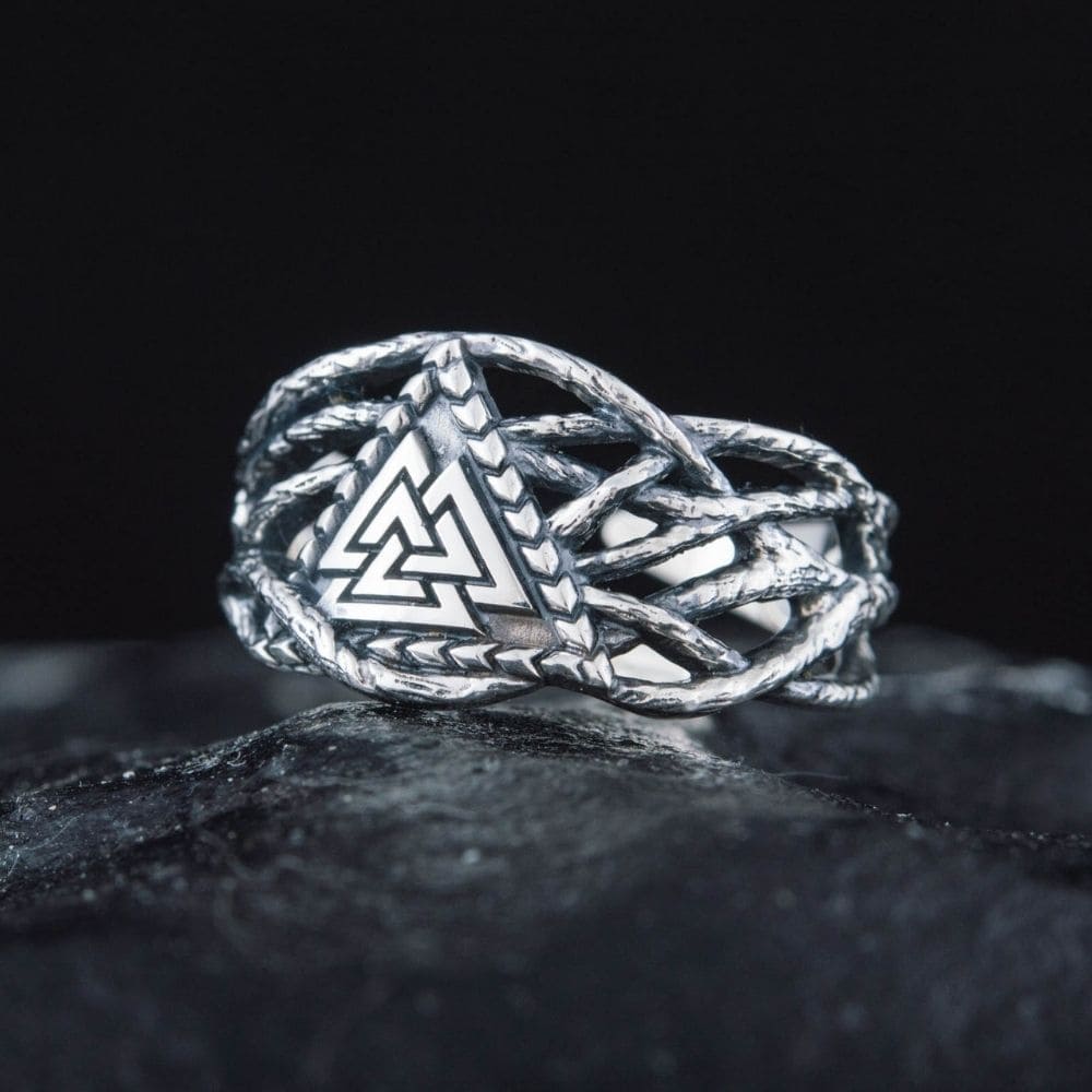 This silver ring with the Valknut symbol stands out for its original and unique design. This striking piece of jewellery features the Valknut symbol intertwined with the branches of the Yggdrasil tree. The word Valknut means "knot of the dead".