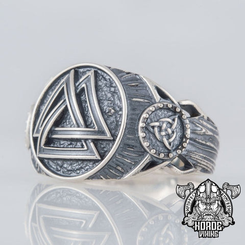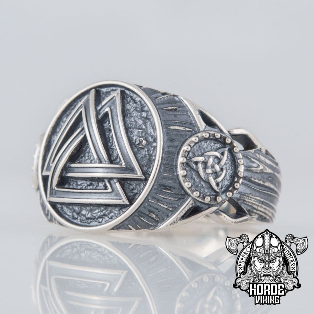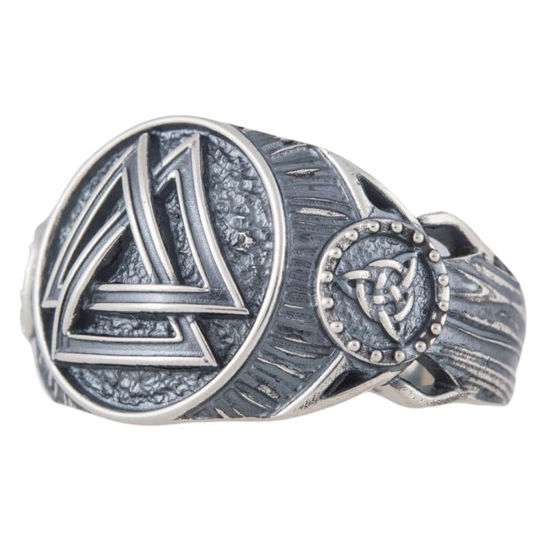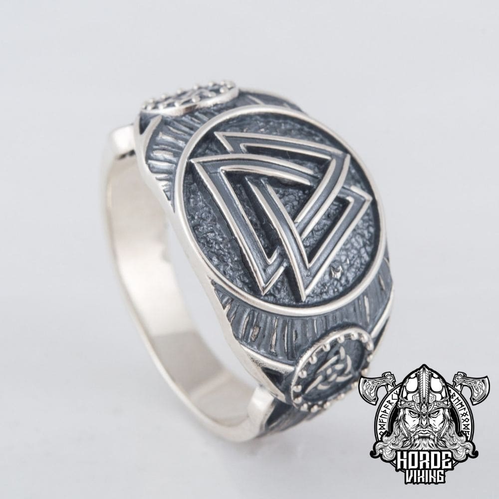This solid silver ring is adorned with the Valknut symbol. This symbol, made up of three interlaced triangles, is the ultimate emblem of a Viking warrior. It has been found on authentic runestones. It represents Odin's warriors, who sit at his table in Valhalla.