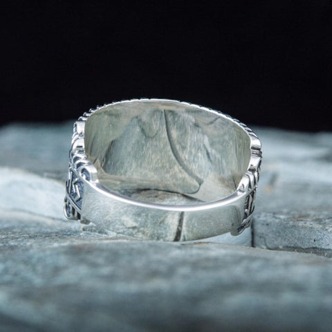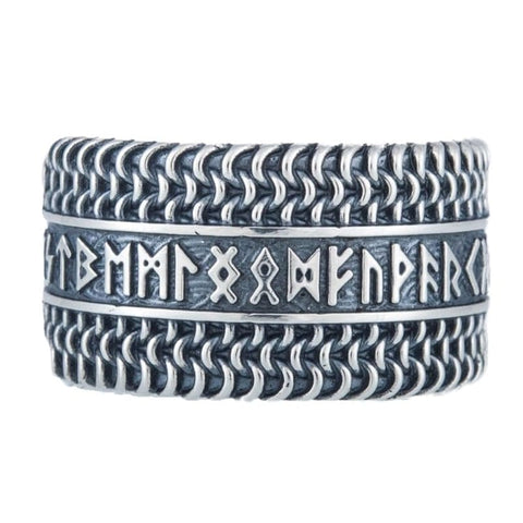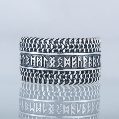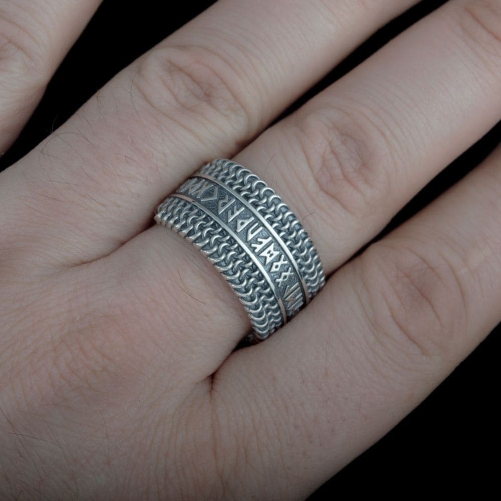 This handmade silver ring is designed to resemble the chain mail worn by ancient Norwegian warriors. The ring is adorned with stunning runic inscriptions, giving it an authentic Viking Era atmosphere.