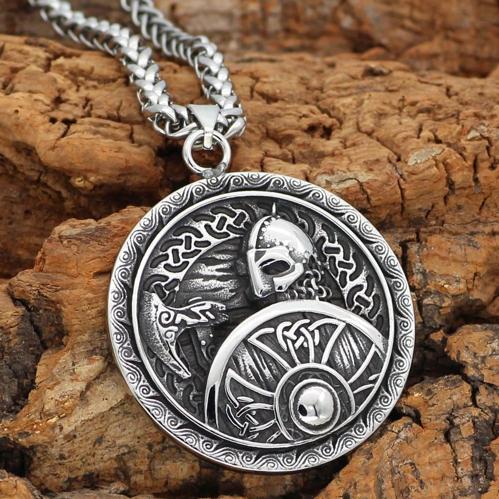 Adorn your neck with this pendant depicting a noble Viking warrior with helmet, axe, and shield.