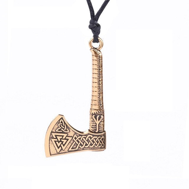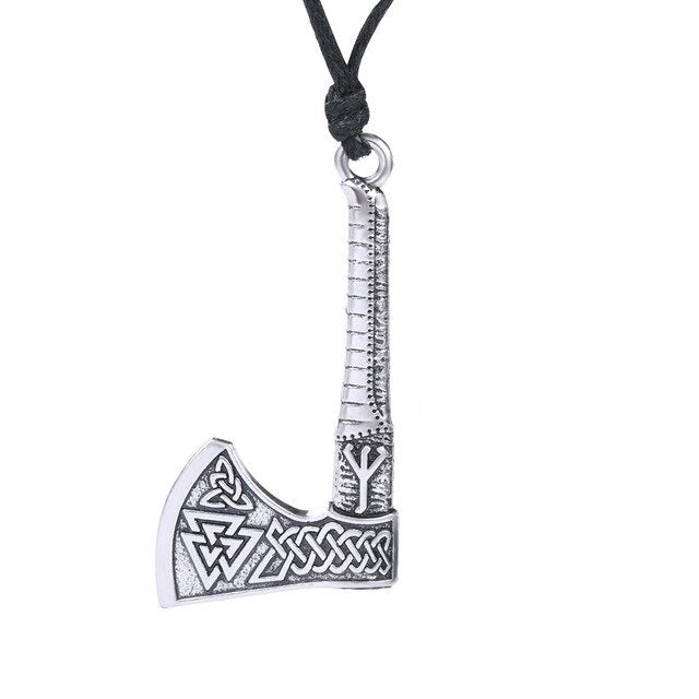 This Nordic axe-shaped pendant is adorned with the Valknut symbol. The symbol is perfectly fitting as the Valknut is known as the emblem of fallen warriors.