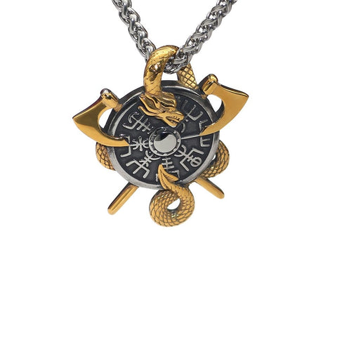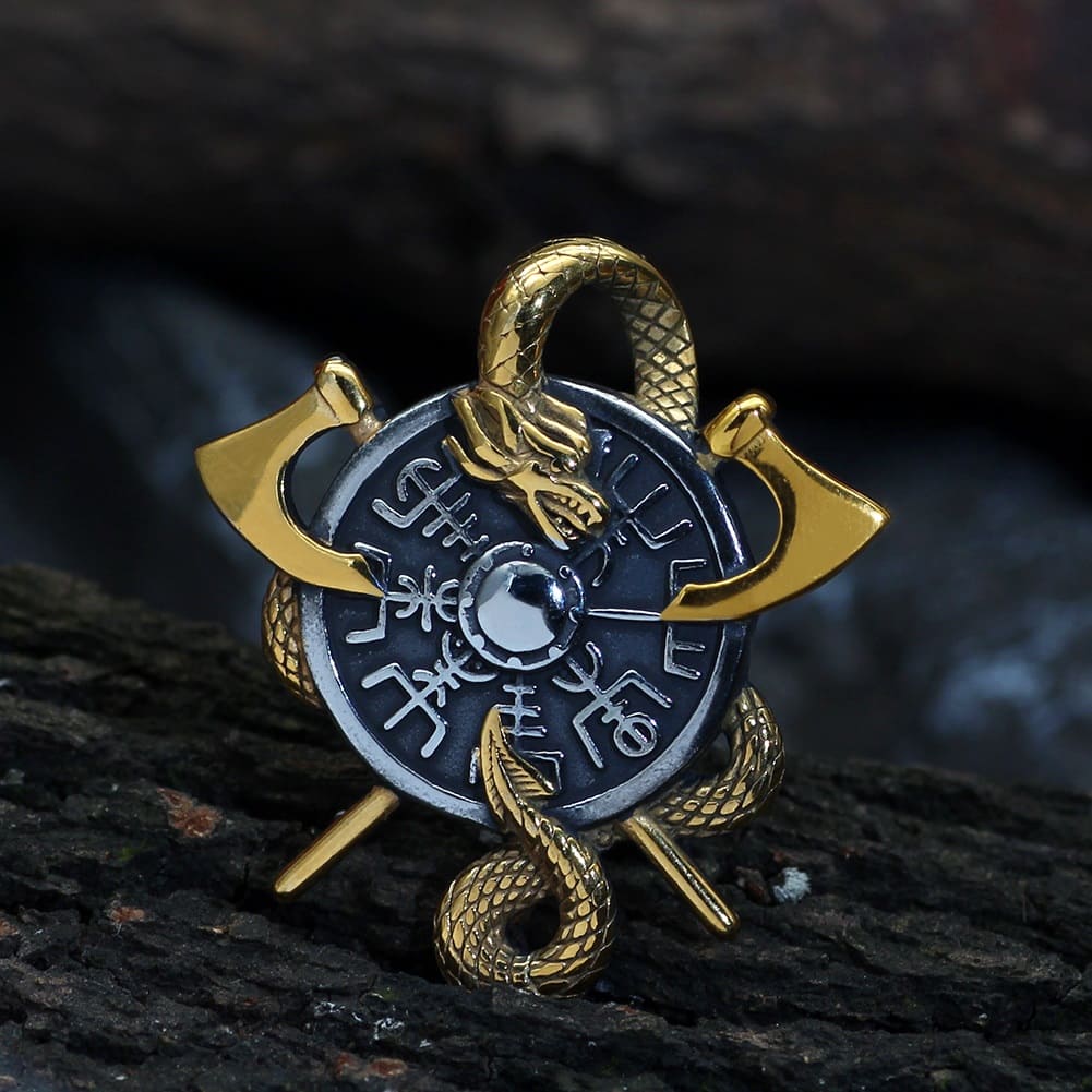 This unique pendant features an image of a dragon and a shield engraved with the magical protection symbol Vegvisir. Two intertwined golden axes complete the design.