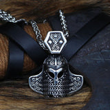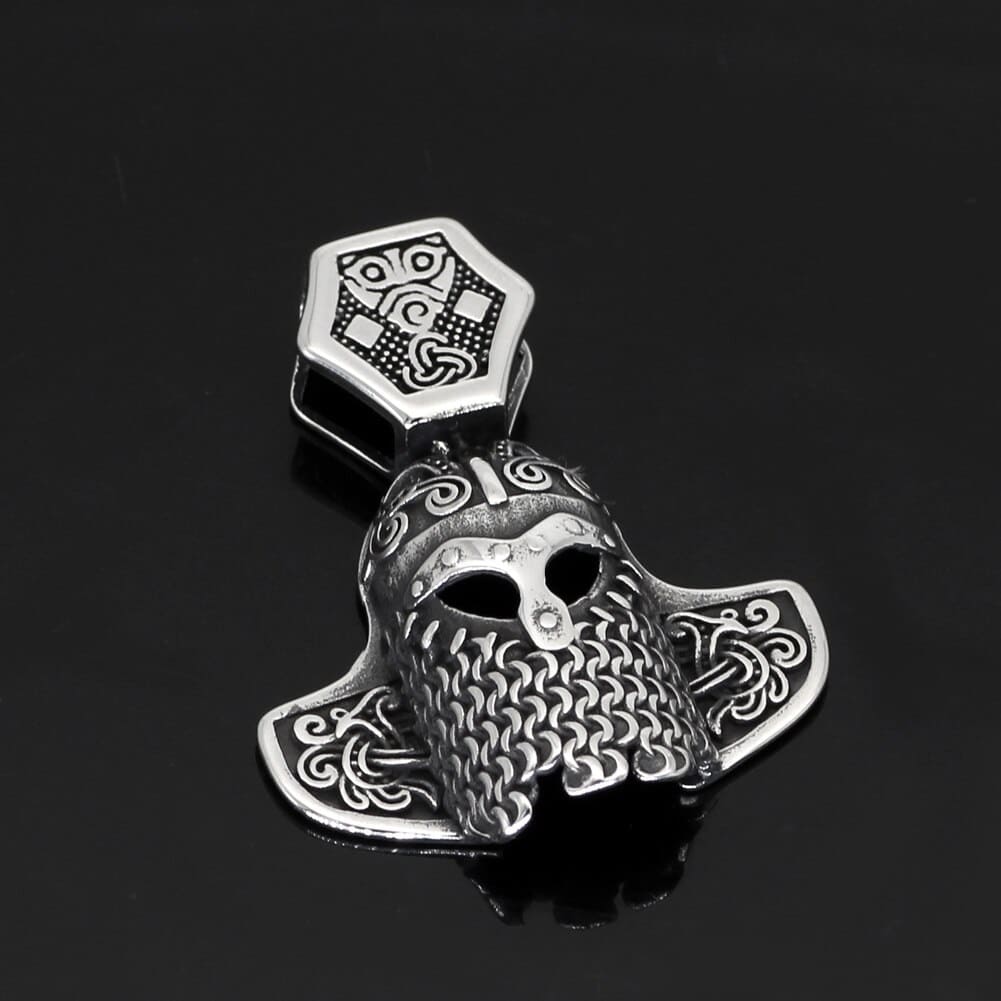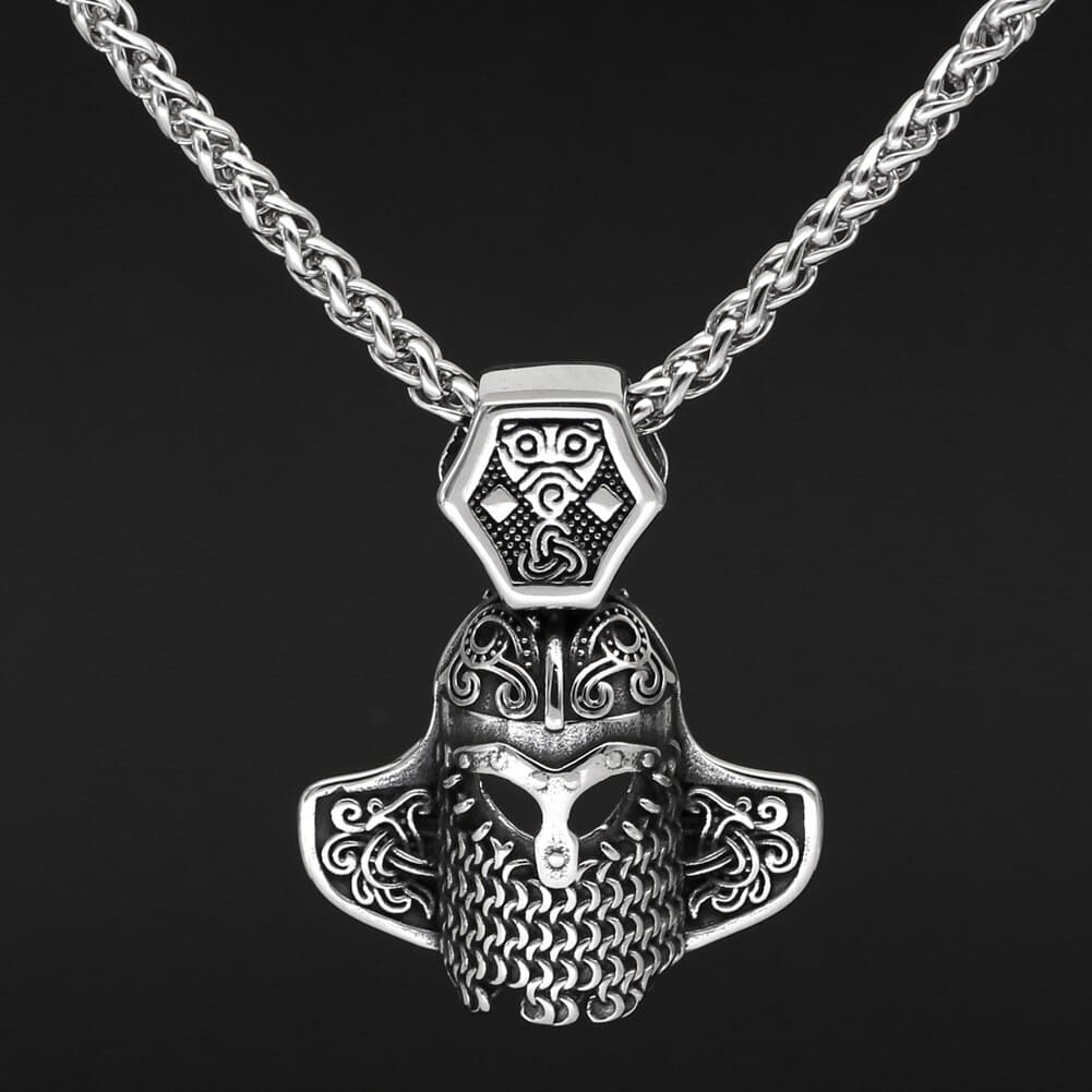 This necklace features a pendant shaped like a Viking warrior's helmet. The helmet is adorned with beautiful ornaments, typical of Scandinavian art.