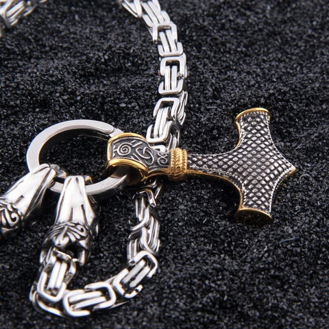 A jarl should wear adornments that clearly express their power and authority. This Viking Jarl necklace is decorated with Thor's hammer and supported by a sturdy chain adorned with two raven heads, evoking unwavering respect.