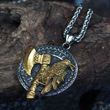 The pendant is made of sturdy and durable steel, featuring a raven and a gold axe. The Valknut symbol can be seen on the blade of the axe. This symbol, made up of three interlaced triangles, is considered the emblem of Odin's warriors, also known as Einherjar.