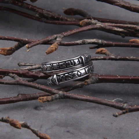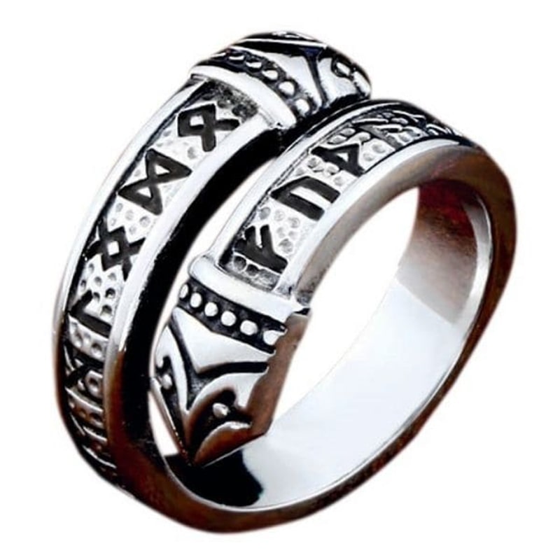 Norse mythology tells that all of Midgård, the world of humans, is held up by the giant serpent Jörmungandr. This ring, adorned with magical runes, is a symbolic representation of the Viking universe.