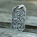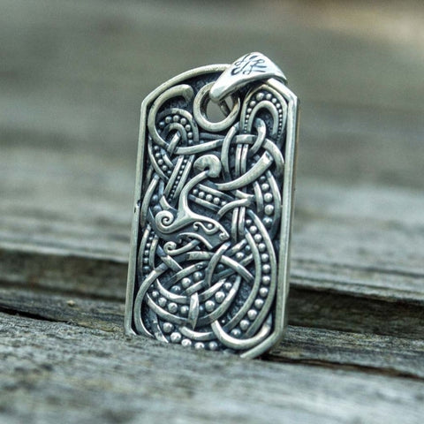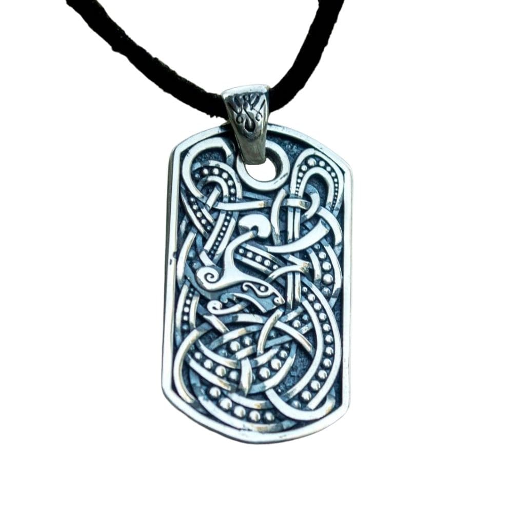 This amulet-shaped pendant represents Scandinavian motifs often found in the runic stones from the Viking's medieval era. The standing stones are one of the few material traces left by the Vikings. These stone sculptures were richly decorated with interlaced patterns, similar to the designs of this magnificent silver necklace.