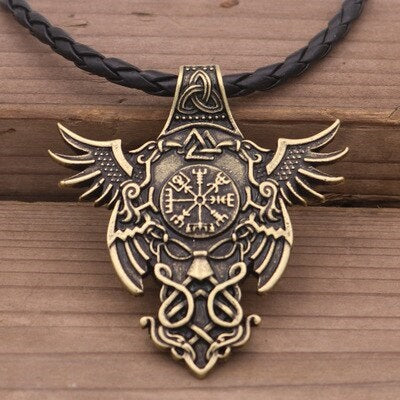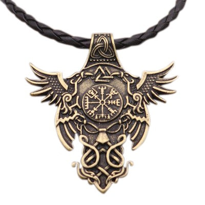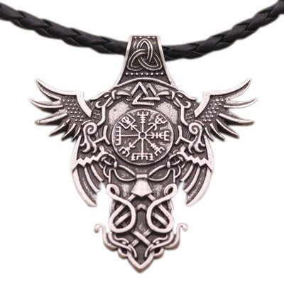 The necklace is adorned with significant Viking symbols. It features Odin's eagles, as well as the mysterious Valknut, Triquetra, and Vegvisir symbols. This pendant is a Viking ornament with numerous references to Odinic symbols widely used in Viking society.