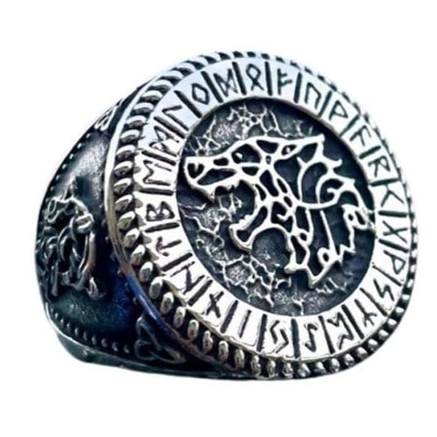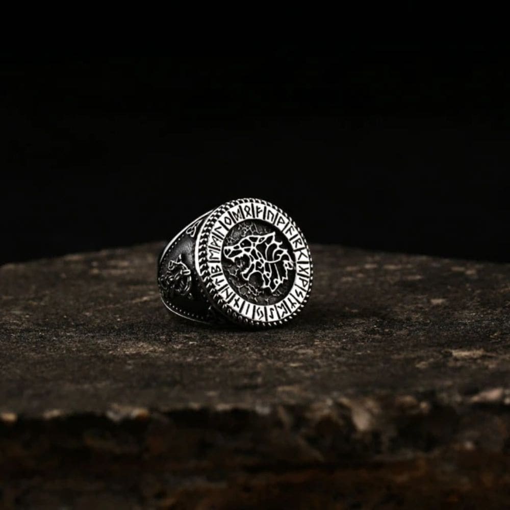 This Viking ring with a wolf's head embodies the fury of the wolf. Decorated with rune inscriptions and Nordic motifs, this ring is an indispensable addition to your Nordic jewellery collection.