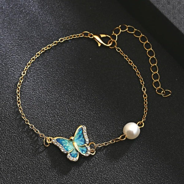 A perfect blend of elegance and vintage style, this butterfly bracelet is gold-plated and adorned with a cultured pearl. The butterfly, the centerpiece of this item, is decorated with brightly coloured enamel, available in three different variations.