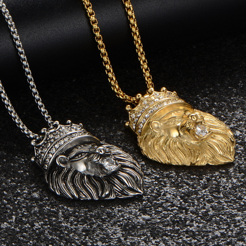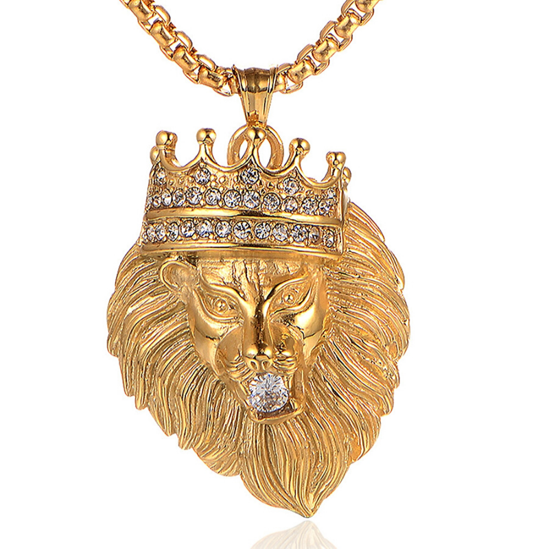Beautiful gold necklace with a lion pendant, featuring a dense mane and a lovely crown - a piece of jewellery with a strong lion identity. Gold lion necklace in stainless steel adorned with small white diamonds.