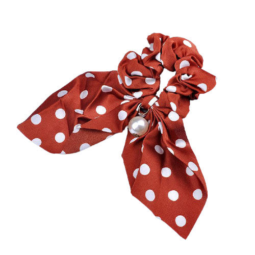 Vintage hair elastic made with satin fabric featuring a pattern of white polka dots on a red-tile background. Satin and a small pearly white pearl. These are the secrets of this adorable vintage scrunchie, adding a touch of whimsy to your hairstyle.