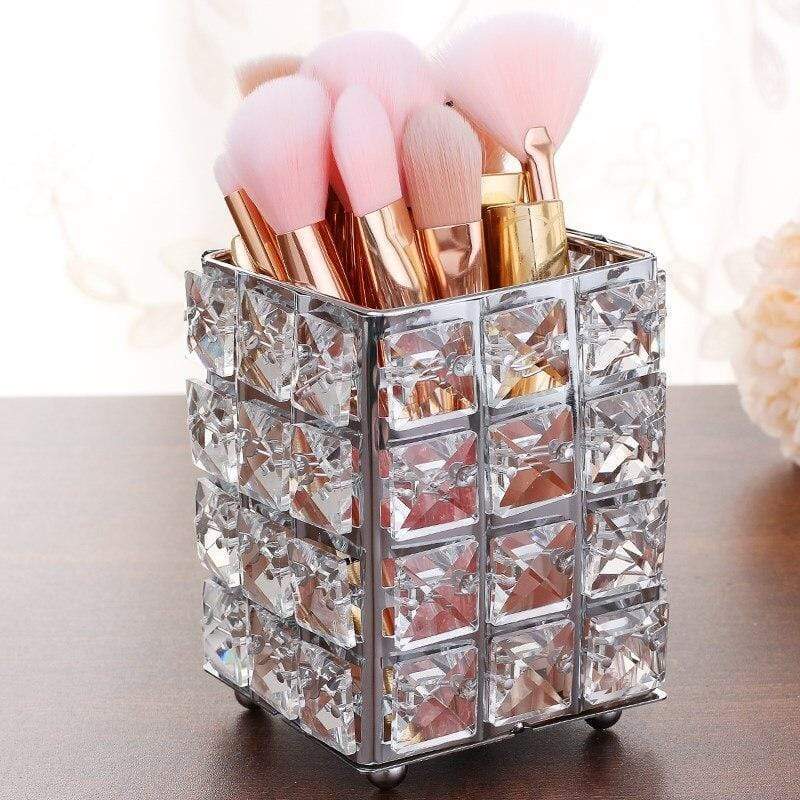 Vintage shiny metal makeup brush holder, perfect for storing makeup brushes and other beauty accessories.