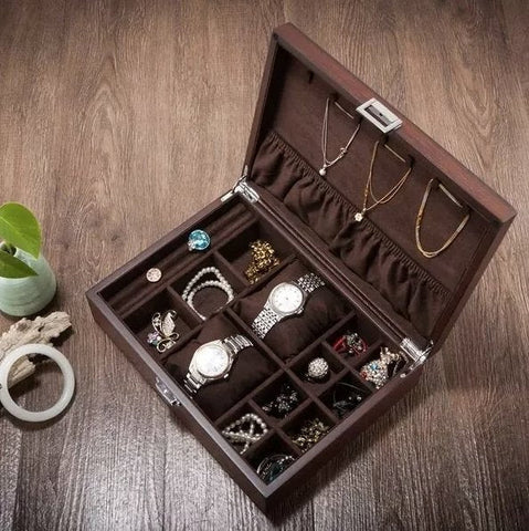 A beautiful wooden jewellery box with a hidden layer underneath another, where you can store your most treasured pieces.