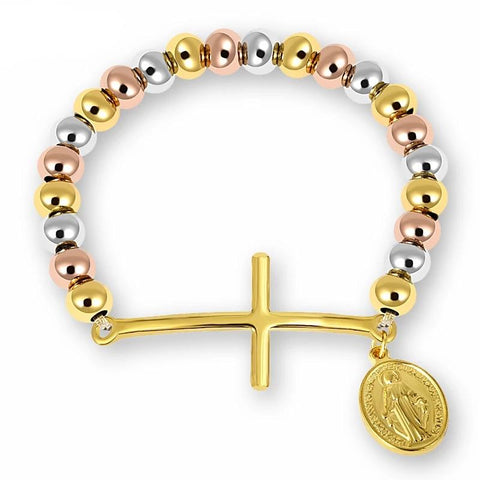 Virgin Mary Bracelet with elastic cord (adjusts to all wrists). A rarely sophisticated and elegant bracelet, with a finely decorated medallion featuring an engraved image of the Virgin Mary, Mother of God. According to Christianity, Mary, mother of Jesus and wife of Joseph, was a Jewish woman from Galilee in the first century BC. According to Christian theology, she conceived Jesus through the action of the Holy Spirit, remaining a virgin.