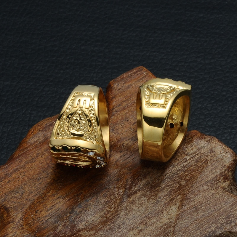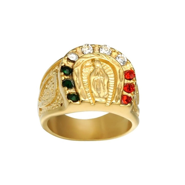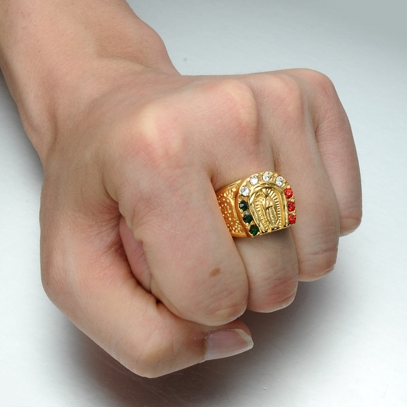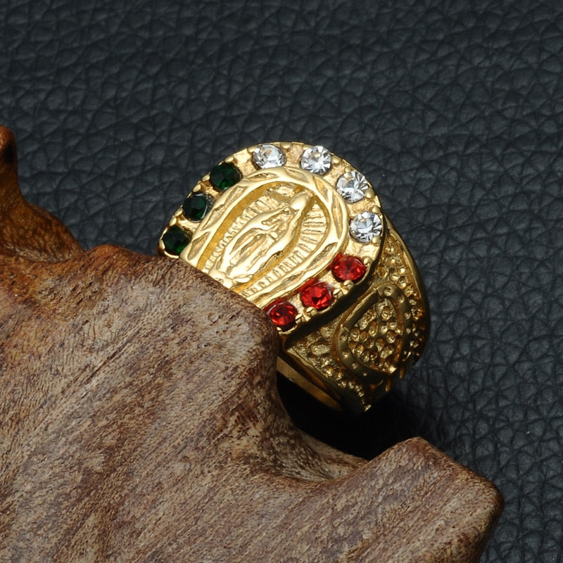 High-quality gold stainless steel Virgin Mary signet ring, adorned with zirconia rhinestones. The image of the Virgin Mary is carefully hand-carved and crafted. The sides of the ring are engraved using an ancient artisanal technique. All the protection and love of the Mother of God right on your finger.