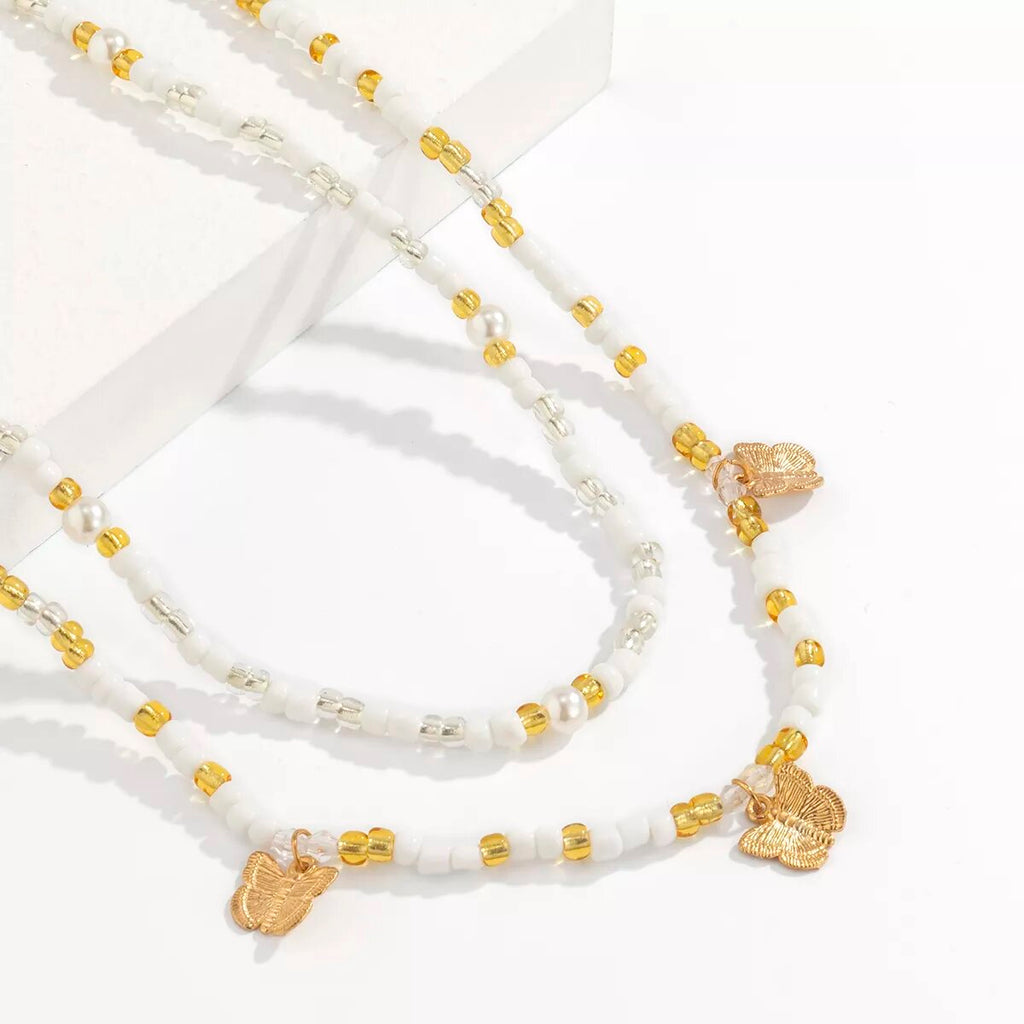 This waist jewellery is a chain worn around the abdomen that enhances your femininity. Decorated with white pearls and small golden butterflies, this female accessory is perfect for a sunny holiday.
