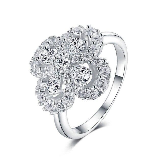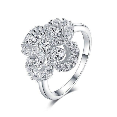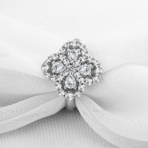 This is our high-quality white gold and diamond floral ring. Its stunning composition of small synthetic white diamonds forms a beautiful and radiant flower. The fit of this ring is adjustable, perfectly adapting to your finger.