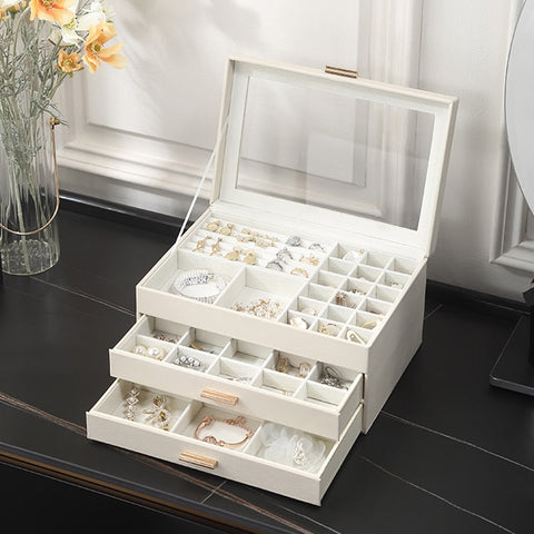 A beautiful white jewellery box to store and protect your accessories. Crafted from high-quality leather, this box delivers exceptional durability. Lined with ultra-soft velvet, it offers optimal protection for your precious jewellery. Thanks to the magnetic closure, your items remain safely secured. The transparent lid provides a clear outside view and adds a touch of elegance to the design. With dimensions of 26.5 cm x 18 cm x 13.5 cm, this spacious case accommodates a wide range of jewellery pieces. It is also waterproof and shock-resistant, ensuring reliable protection at all times. The white jewellery box is the perfect accessory for discerning jewellery lovers who value both function and style.- Designed with high-quality polyurethane