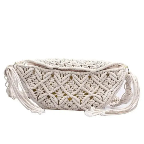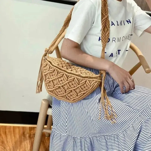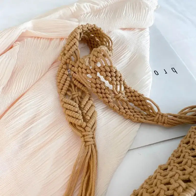This women's bum bag is hand-made with cotton thread, giving it a trendy knitted look. It is a favourite amongst women seeking a natural and simple look. This accessory is ideal for anyone wanting a stylish, relaxed, and functional waist bag. It is perfect for adding a bohemian touch to your summer outfits, while keeping your essentials close at hand.
