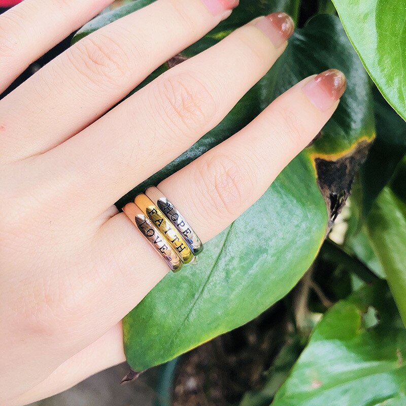 These rings have been carefully engraved with different words that directly reflect your Christian faith. The silver ring is engraved with the word "Hope", the gold ring has the word "Faith" and the rose ring has the word "Love". As hope, faith, and love are always present in you when your thoughts turn to God, these stunning rings are a supreme and discreet symbol of your faith in God's strength.