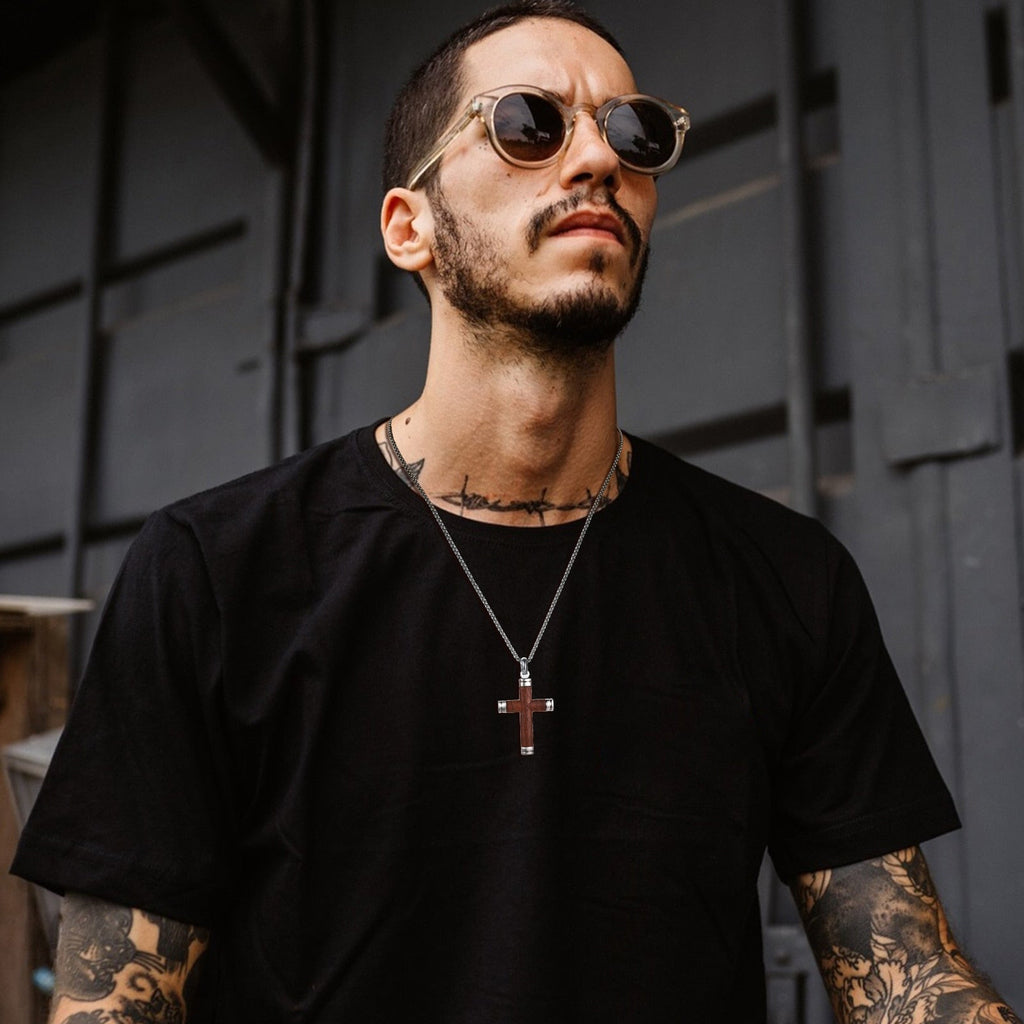 This beautiful wooden cross necklace is a true gem that combines nature and tradition. It's an excellent blend of wood and steel, adorning your neck with subtlety and elegance!