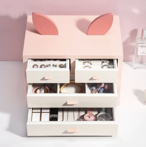 This adorable Wooden Girls’ Jewellery Box features 4 removable drawers. The dividers can be taken out to create space for one large compartment. The wooden ears are also detachable. This jewellery box is suitable for both younger and older children. The interior is lined with ultra-soft velvet to protect your precious jewellery from potential wear and tear. It will make a lovely accessory for any feminine décor.