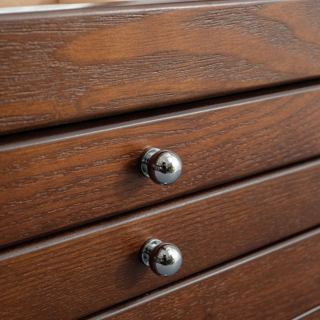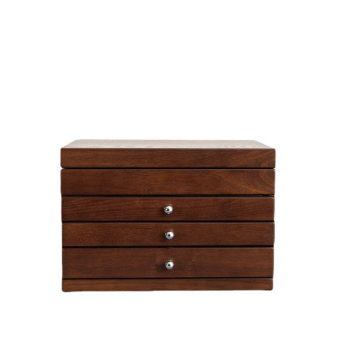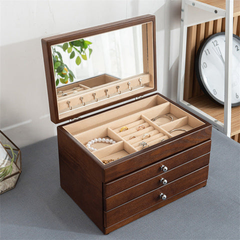 Elevate your jewellery collection with this elegant wooden jewellery box in a classic and timeless design. Crafted with exceptional attention to detail, it combines sturdiness and aesthetics to complement any interior. With three spacious drawers and a compartmentalised top tray, it offers ideal organisation for your rings, bracelets, necklaces, and earrings.
