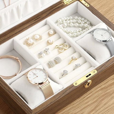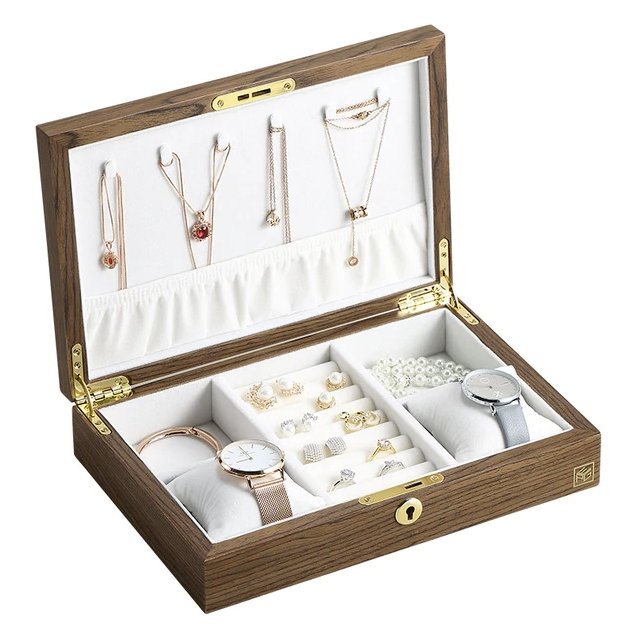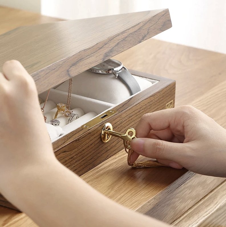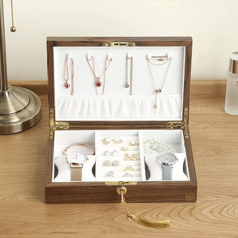 Wooden Jewellery Box with Lock is the perfect way to keep your jewellery safe and organised. Cushions for storing watches are included. Hooks are also provided to neatly hang your necklaces. To ensure your valuables are securely stored, the box comes with a key lock. Designed with meticulous attention to detail, it doubles as a decorative piece, adding a touch of luxury to your space.