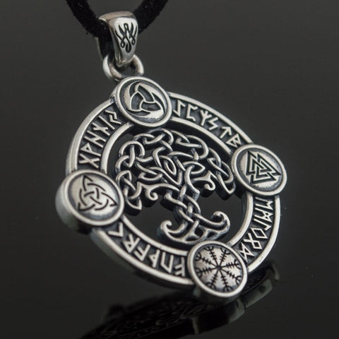 This silver Yggdrasil pendant is a symbolic representation of the Nordic Tree of Life. The pendant is composed of a circle engraved with the 24 letters of the runic alphabet. It is also adorned with four major Nordic symbols: the Valknut symbol, the Triquetra, the Horns of Odin, and the Aegishjalmur symbol.