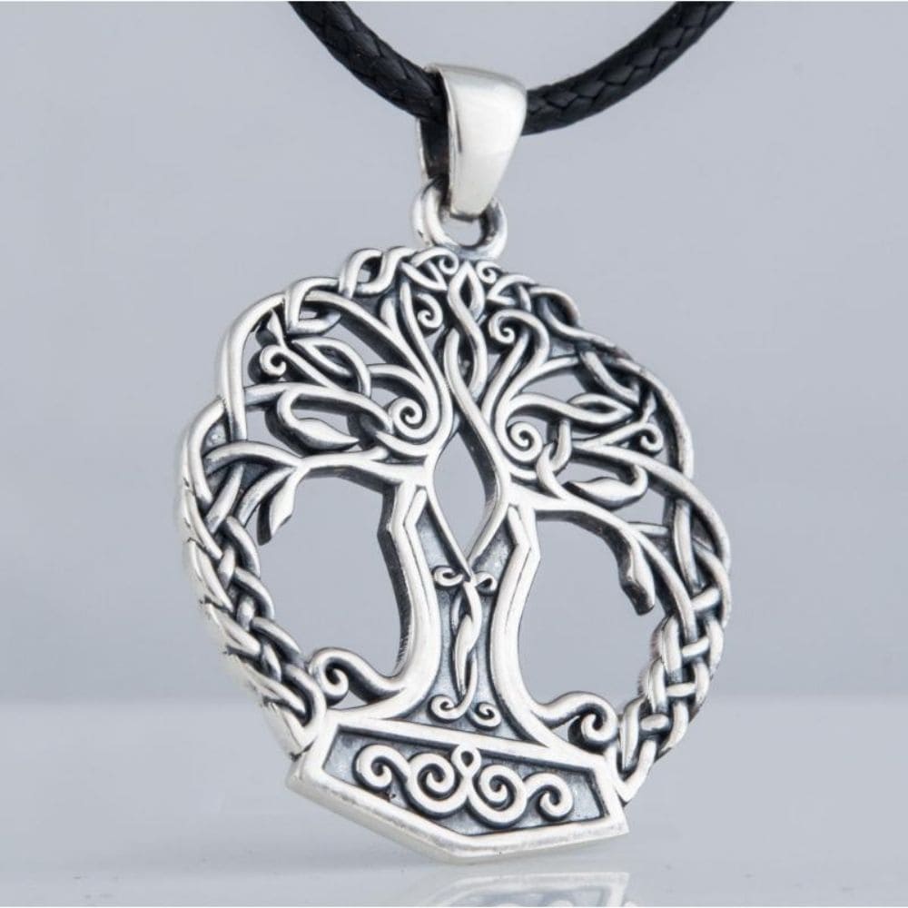 This necklace represents the mythical Yggdrasil tree. The tree's trunk depicted in this necklace is shaped like the legendary hammer, Mjöllnir.